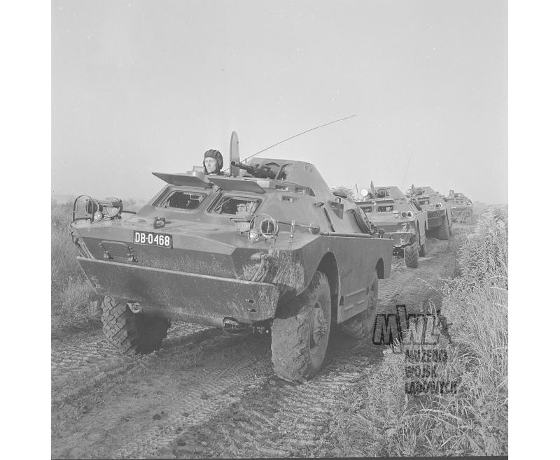 Ćwiczenia na poligonie w 1974 roku. Opancerzone samochody rozpoznawcze BRDM-2 poruszające się w kolumnie.